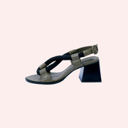 Sandália em couro com corda e vira, salto alto madeira de reflorestamento.