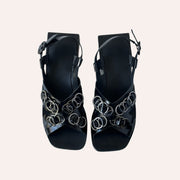 Sandália produzida com parte superior em verniz molhado e ferragens grafite. Salto em madeira com altura de 2,5 cm.