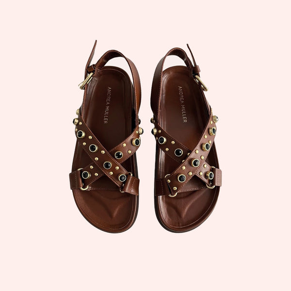 Sandália em couro, solado em borracha, com detalhes em metais ouro velho e cristais preto.