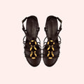 Sandália produzida em couro com argolas de madeira e salto 3cm.