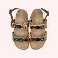 Sandália produzida em couro nobre bem macio com pedras coloridas.